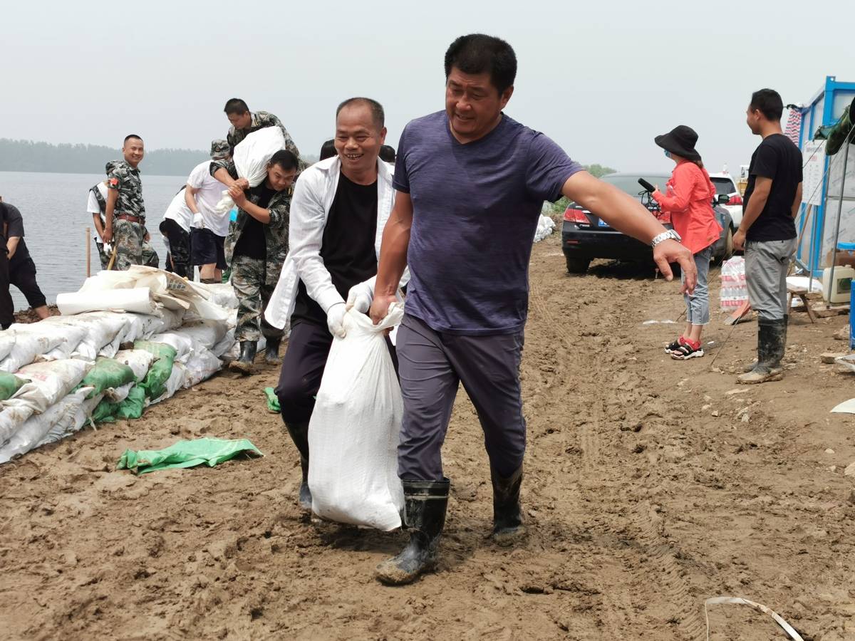 每次防汛,吳勁松(藍色衣服者)總是沖在最前面扛沙包、筑堤壩。(受訪者供圖)