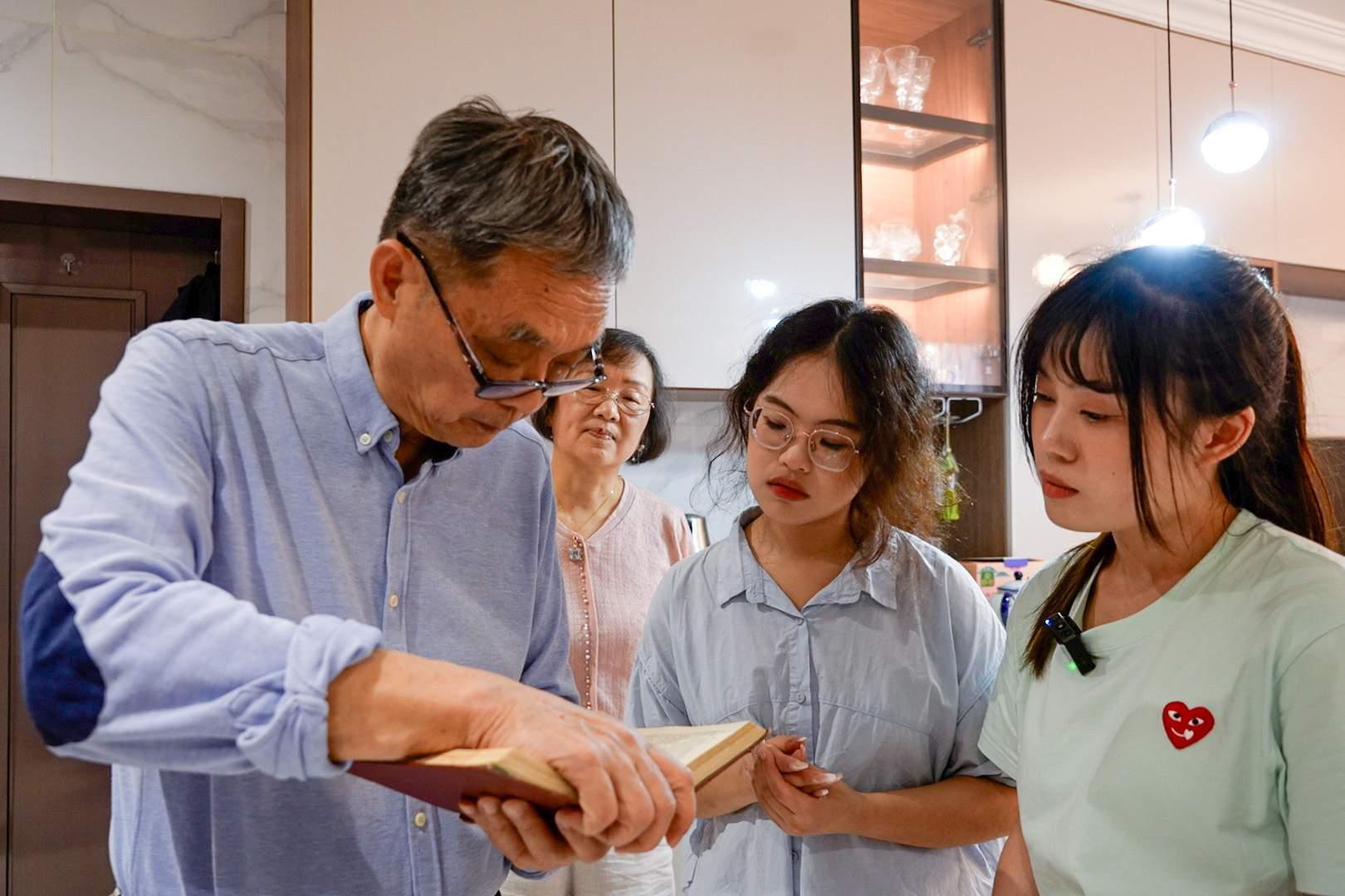 吳杰明(右一)向兩名臺灣女生講述父親吳壯達(dá)的手稿。記者楊佳峰 攝