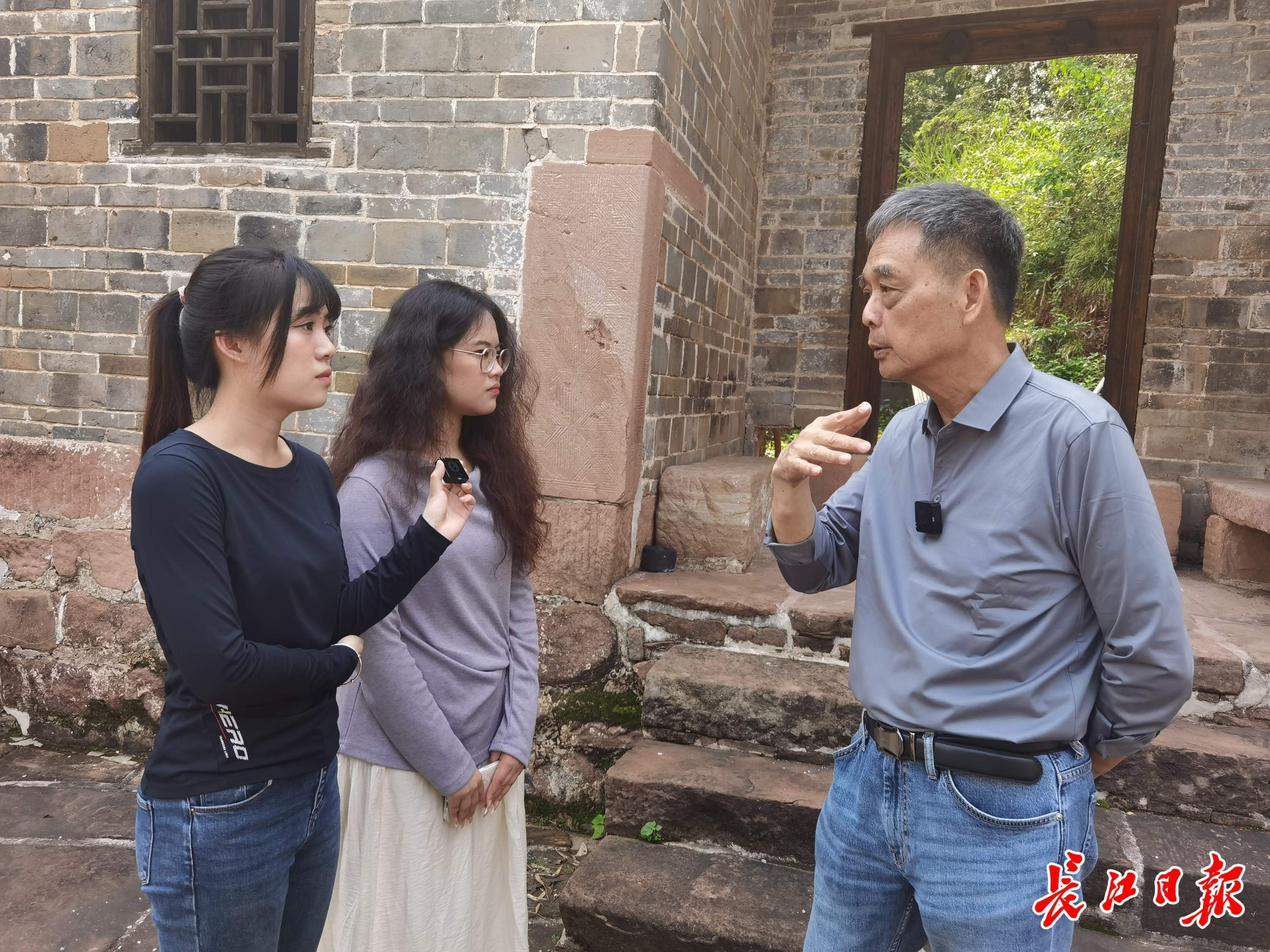 在中山大學(xué)坪石舊址,吳杰明(右一)向兩名臺灣女生講述父親在坪石的工作經(jīng)歷。記者楊佳峰 攝