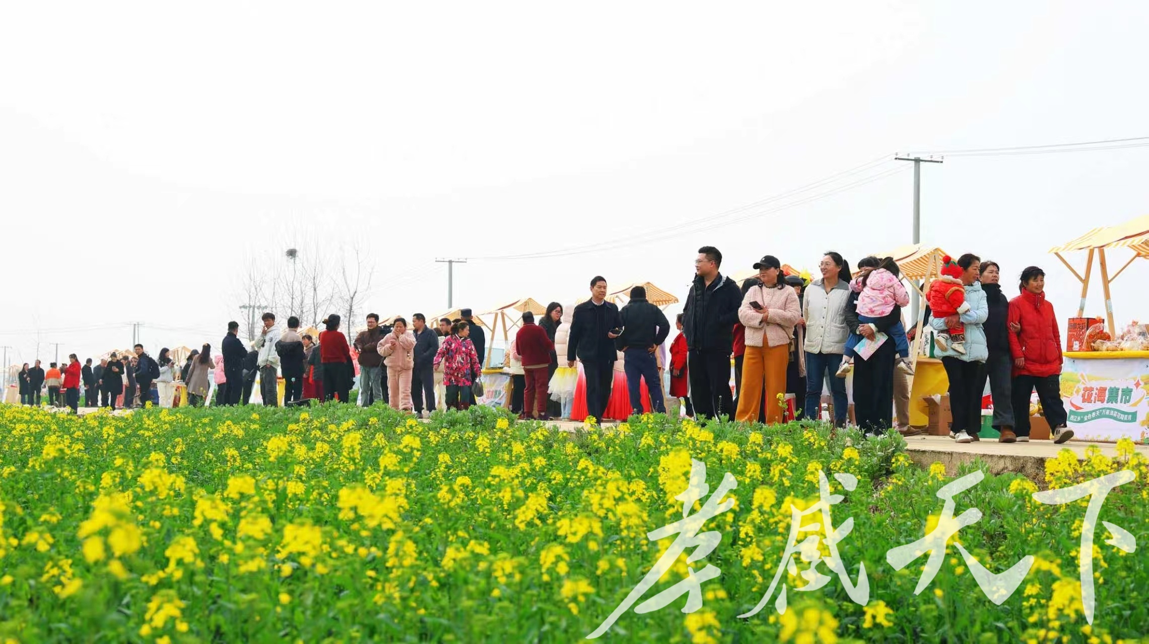 油菜花海旁邊市集上游客駐足賞花。