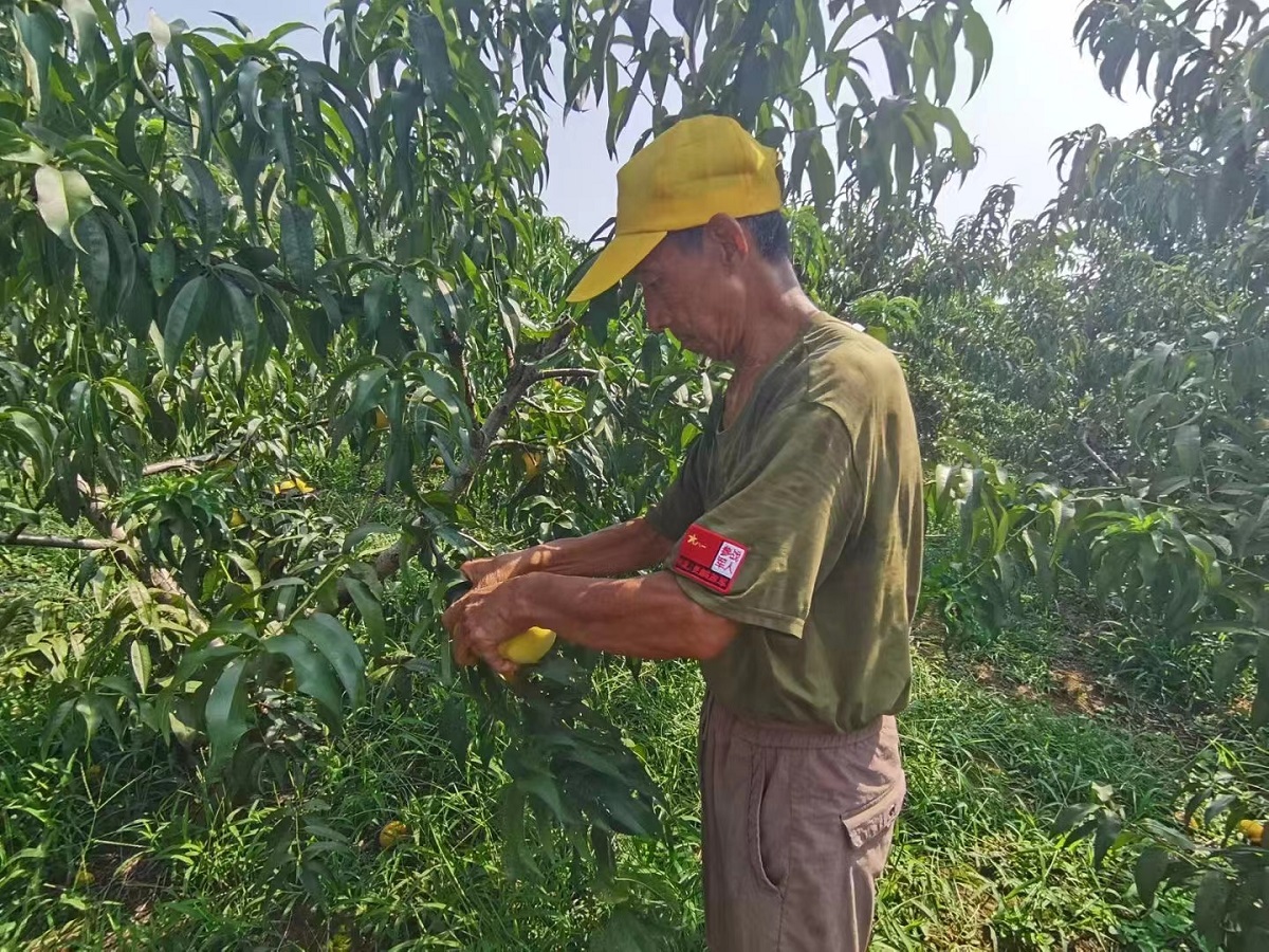 | 眼下,桃子已迎來(lái)成熟采摘期。8月3日早上八點(diǎn),記者在錢(qián)場(chǎng)鎮(zhèn)廖沖村黃桃園內(nèi)看到一個(gè)個(gè)黃燦燦的桃子長(zhǎng)勢(shì)喜人,桃香四溢??粗S桃壓彎枝條的豐收?qǐng)鼍埃瑘@主桂以松卻十分焦慮。此時(shí),園內(nèi)溫度高達(dá)40攝氏度,桂以松 |